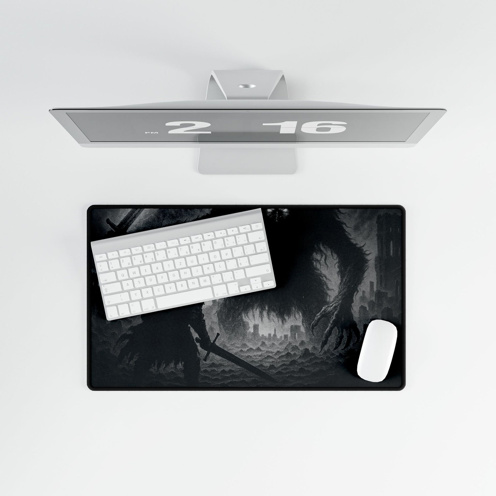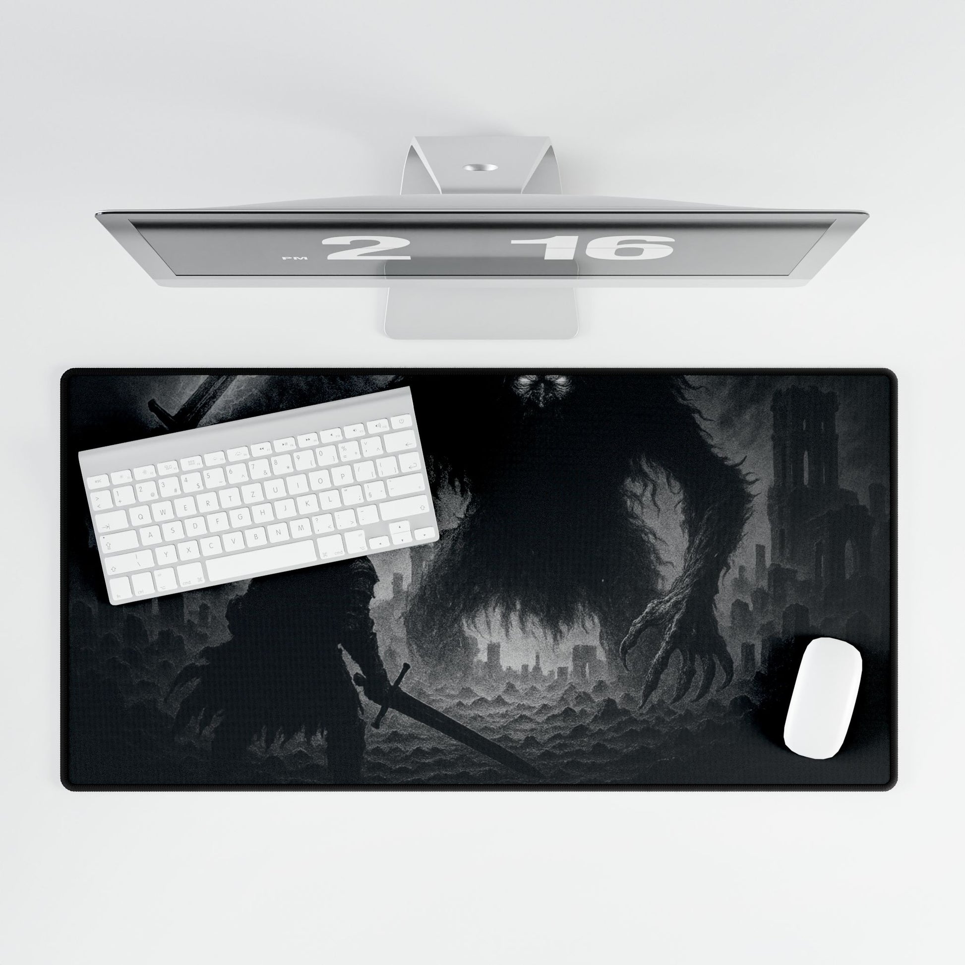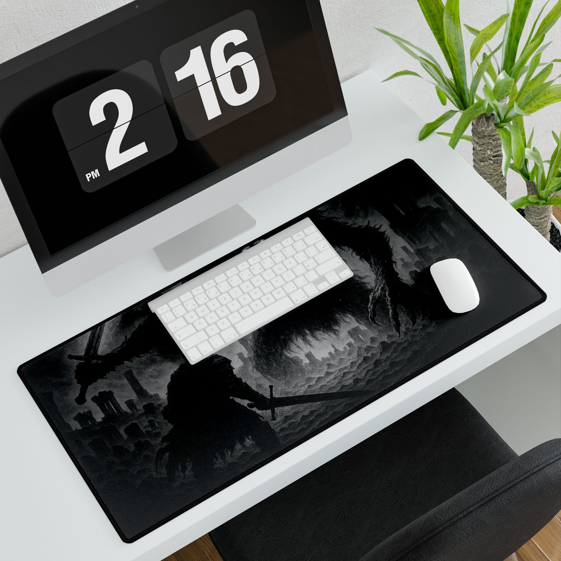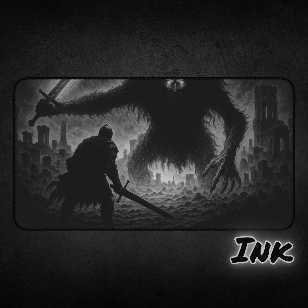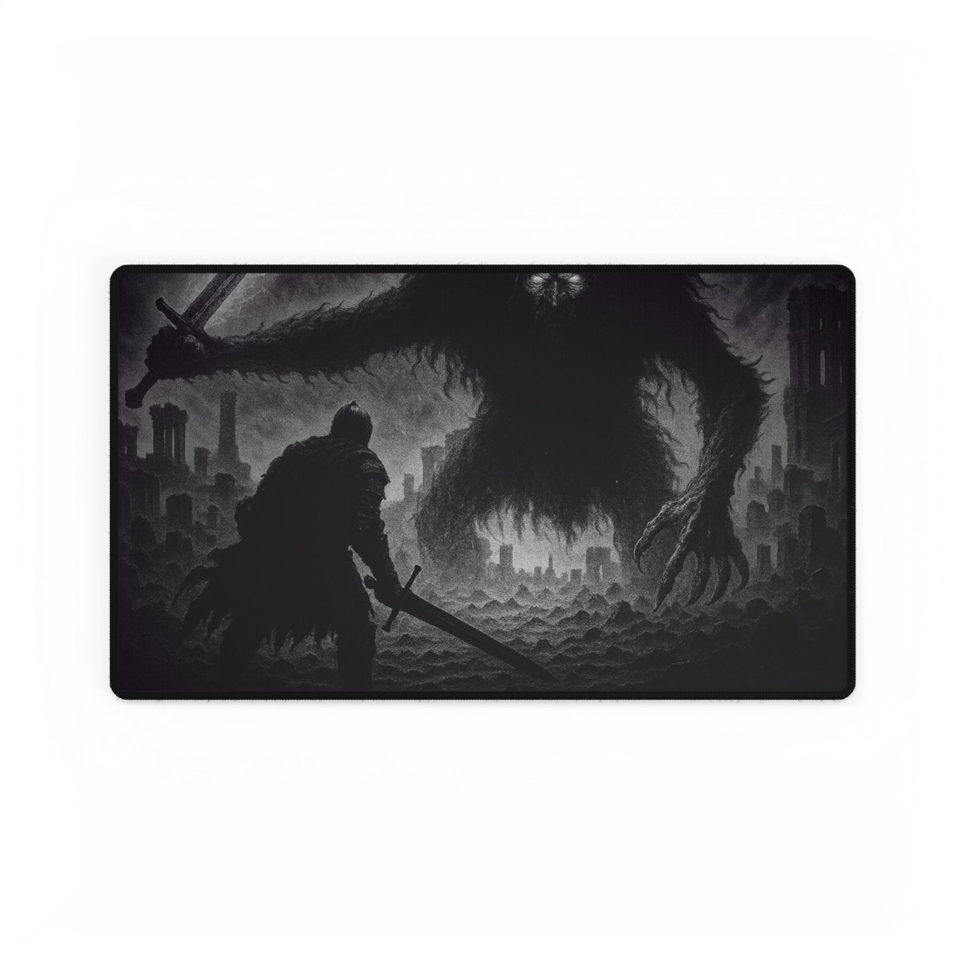 The Final Boss playmat is your last stand in fabric form—a cinematic battlefield for trading card clashes or commanding your digital empire. Center stage on this premium-quality playmat looms a towering, shadow-cloaked monstrosity with blazing eyes and a sword forged from dread itself. Opposite this loathsome creature stands a lone, defiant warrior in ragged armor, framed by crumbling ruins and bathed in the eerie glow of a cursed dusk. It’s not just a fight—it’s a reckoning. Crafted with a smooth, high-performance surface for flawless card slides and razor-sharp mouse precision, it also features a non-slip rubber backing that keeps your setup steady through even the fiercest showdowns. Whether you’re confronting ancient evils or chasing glory in the ashes, the Final Boss playmat is your arena of legend.